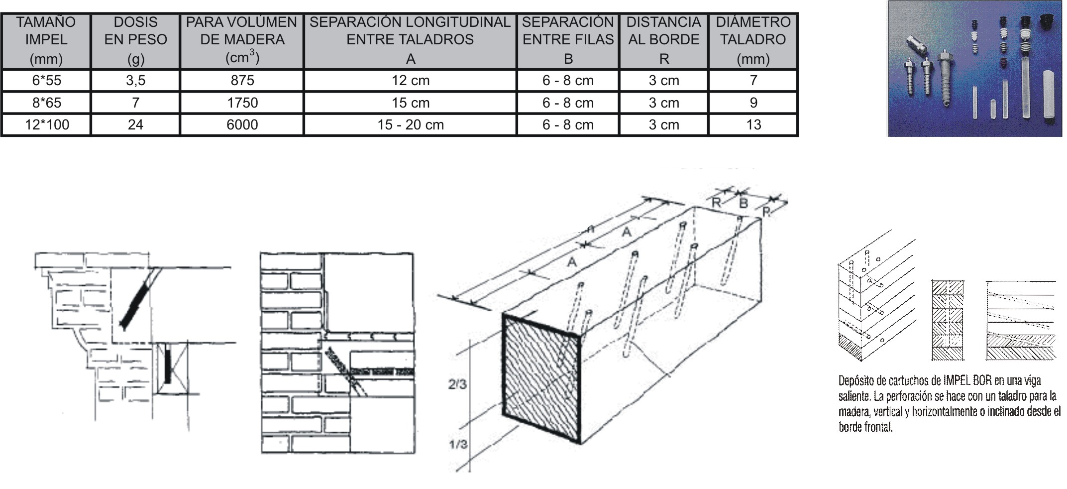 | Para colocar los cartuchos, guardar las instrucciones de los gráficos adjuntos, evitando vasos comunicantes. Conviene que el cartucho se coloque lo más cerca posible del duramen de la madera, siguiendo las instrucciones de la tabla adjunta. | ||