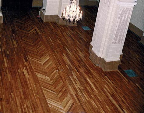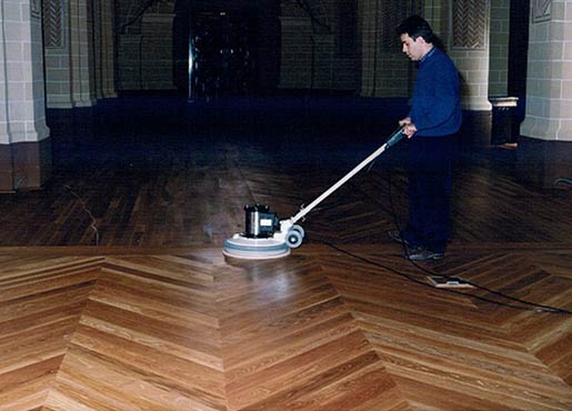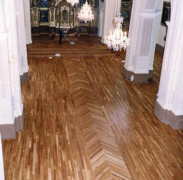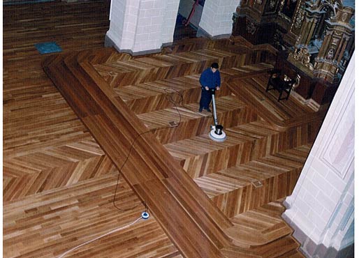 Pavimento en madera de roble tratada con aciete Jensen SI-33, única solución valida, motivada por el exceso de humedad en el subsuelo que aflora a la superficie.