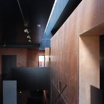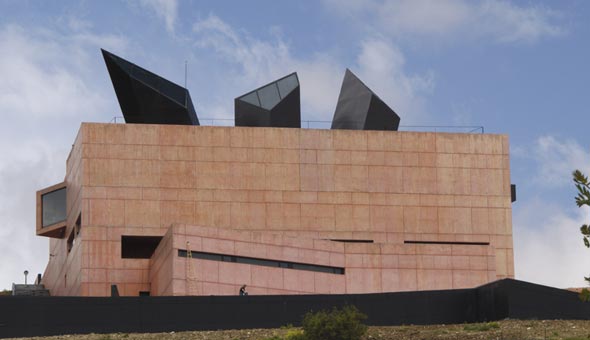 de Oiza, es un gran cubo de hormigón rojizo. El tratamiento del hormigón